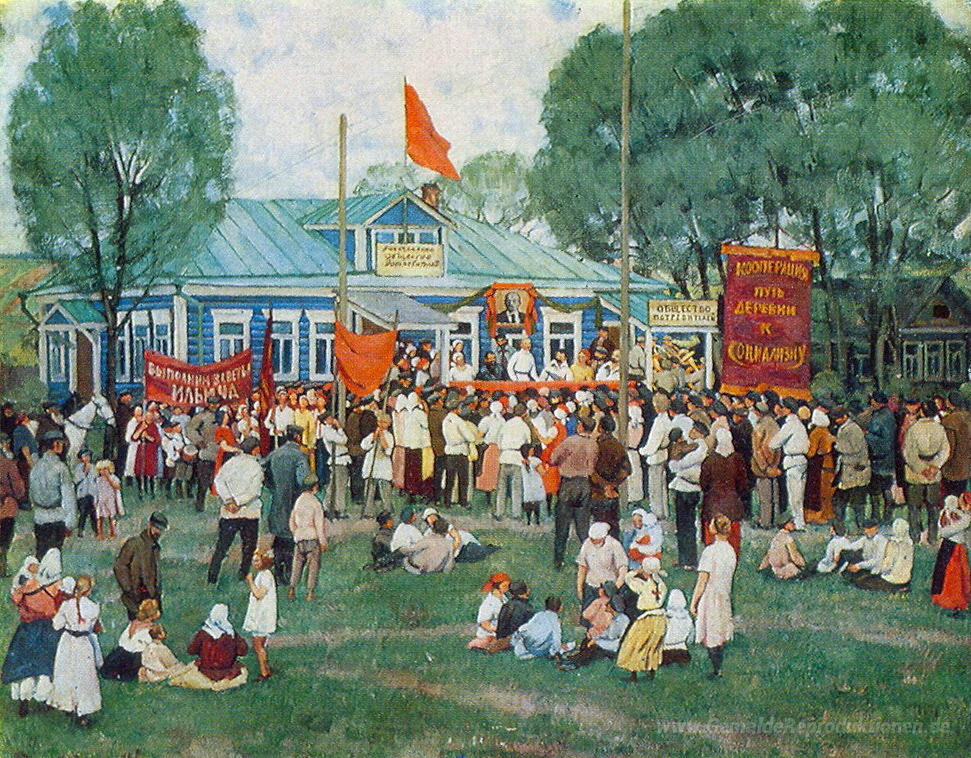 Wir bieten Ihnen eine handgefertigte Reproduktion auf Leinwand des berühmten Kunstwerks 'Das Holiday der Zusammenarbeit auf dem Land' von Konstantin Yuon, aus dem Reproduktionsmuseum.