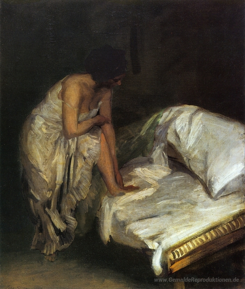 Wir bieten Ihnen eine handgefertigte Reproduktion auf Leinwand des berühmten Kunstwerks 'Das Kinderbett' von John French Sloan, aus dem Reproduktionsmuseum.