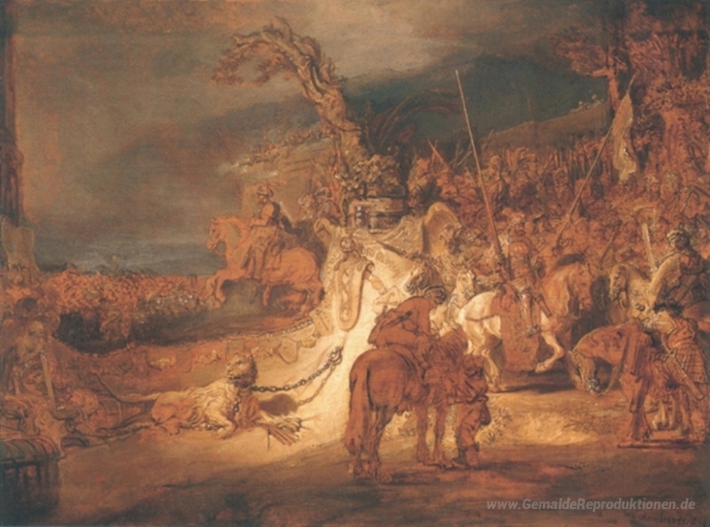 Die impressionistischen und dramatischen Elemente in Rembrandts Arbeit drücken Emotionen aus, die weit über die Leinwand hinausreichen. Die künstlerische Raffinesse und die sorgfältige Komposition machen jedes Ölgemälde zu einem einzigartigen Erlebnis und tragen entscheidend zur Atmosphäre Ihres Wohnraums bei. Lassen Sie sich von der kraftvollen Präsenz Das Konzert des Staates inspirieren und verwandeln Sie Ihr Zuhause in eine Galerie erlesener Kunst.