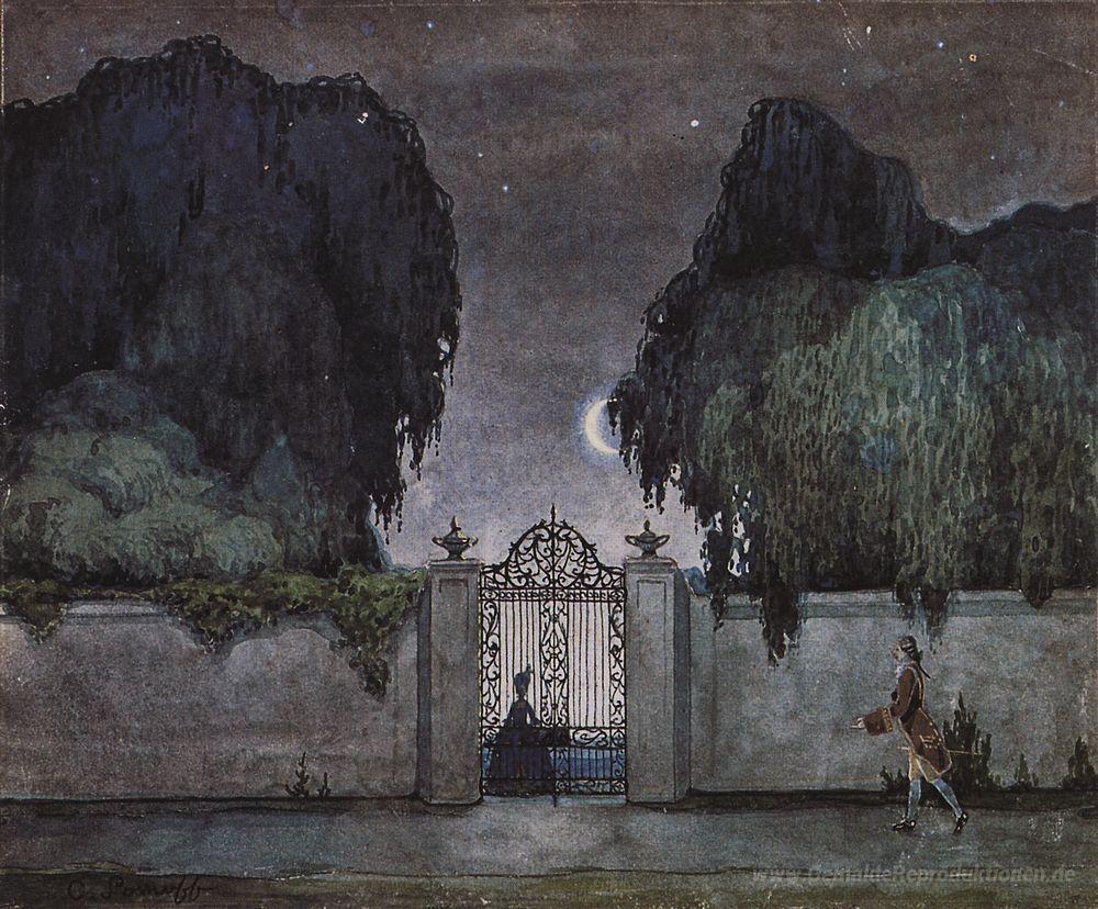 Wir bieten Ihnen eine handgefertigte Reproduktion auf Leinwand des berühmten Kunstwerks 'Datum Nacht' von Konstantin Somov, aus dem Reproduktionsmuseum.