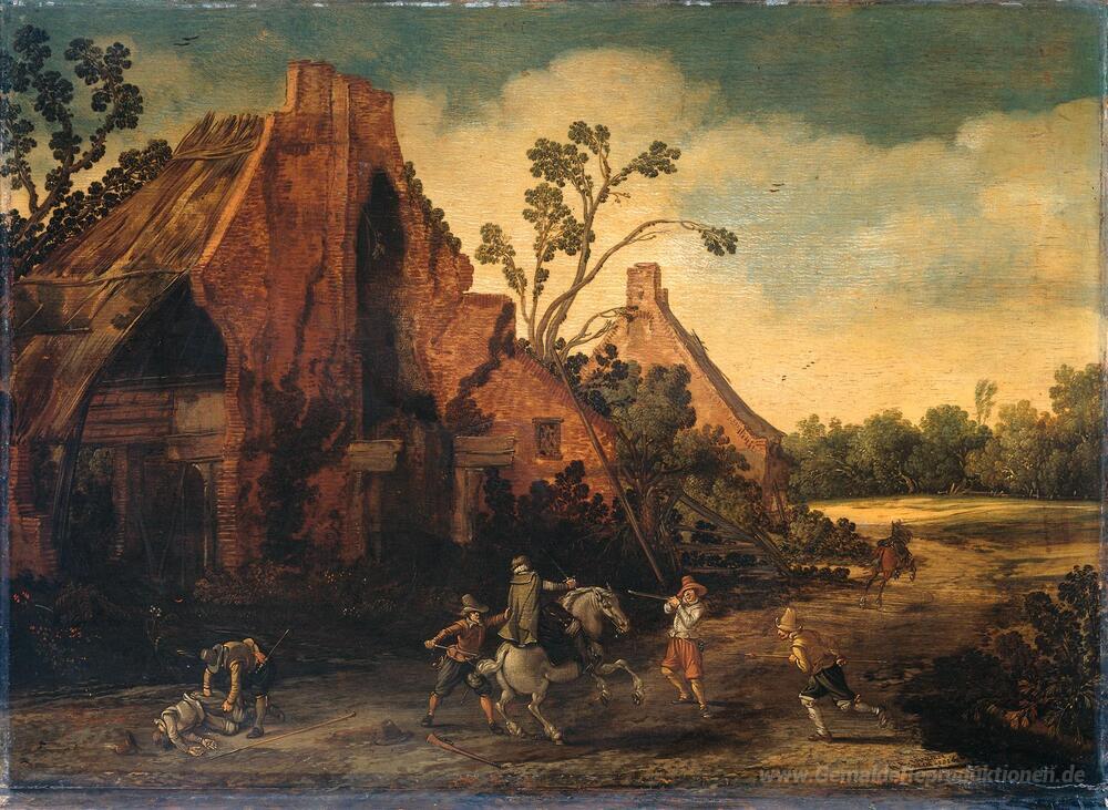 Wir bieten Ihnen eine handgefertigte Reproduktion auf Leinwand des berühmten Kunstwerks 'Der Überfall' von Esaias van de Velde, aus dem Reproduktionsmuseum.