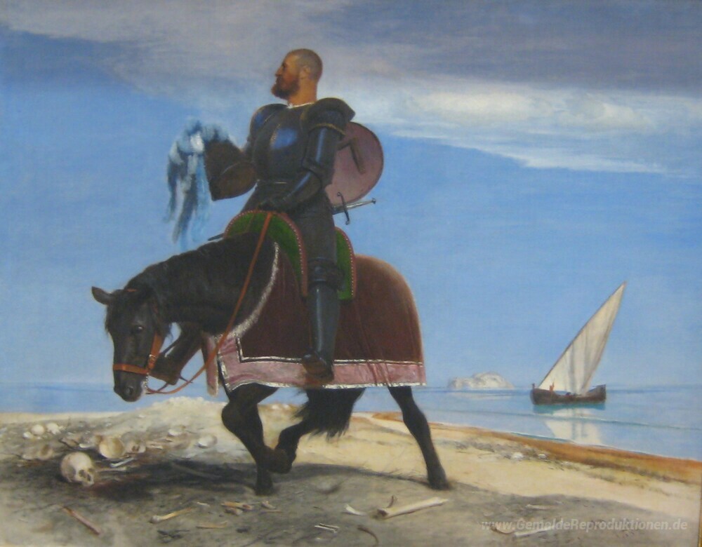 Wir bieten Ihnen eine handgefertigte Reproduktion auf Leinwand des berühmten Kunstwerks 'Der Abenteurer' von Arnold Böcklin, aus dem Reproduktionsmuseum.