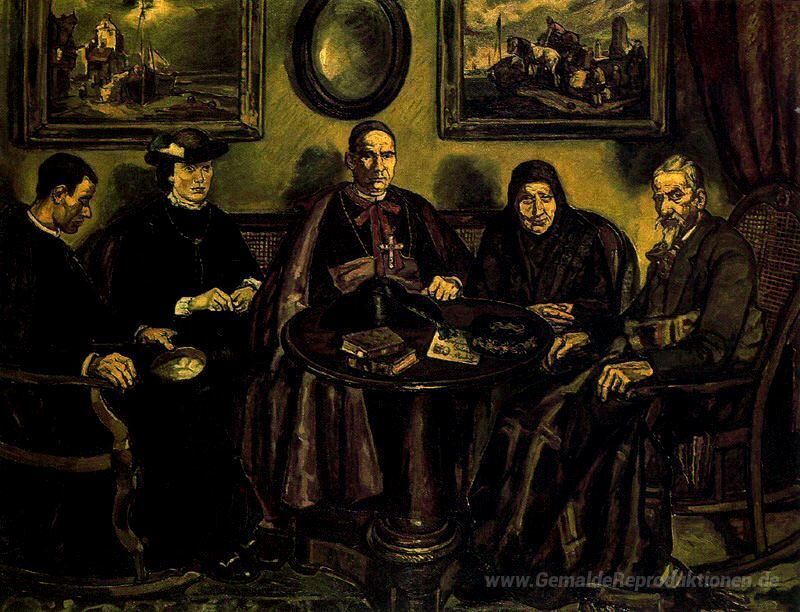 Wir bieten Ihnen eine handgefertigte Reproduktion auf Leinwand des berühmten Kunstwerks 'Der Bischofs Besuch' von Jose Gutierrez Solana, aus dem Reproduktionsmuseum.