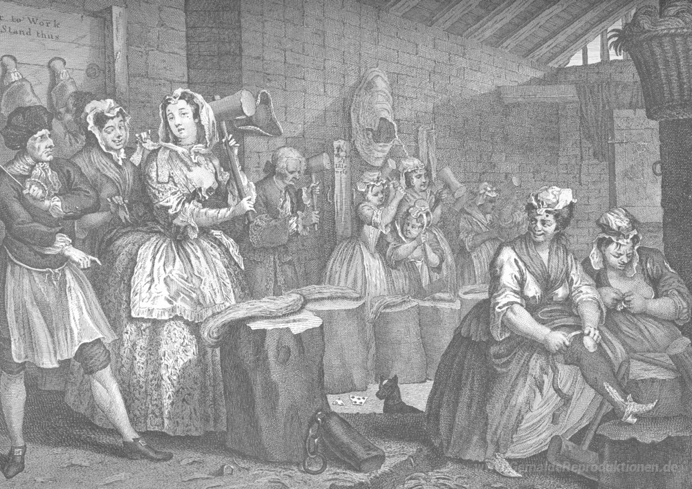 Wir bieten Ihnen eine handgefertigte Reproduktion auf Leinwand des berühmten Kunstwerks 'Der Fortschritt eines Harlots, Platte 4' von William Hogarth, aus dem Reproduktionsmuseum.