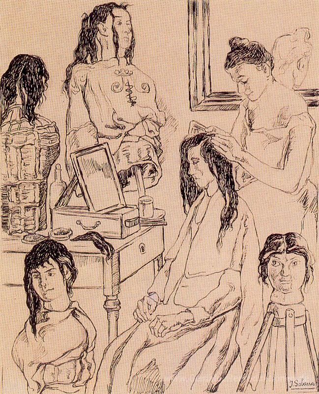Wir bieten Ihnen eine handgefertigte Reproduktion auf Leinwand des berühmten Kunstwerks 'Der Friseur' von Jose Gutierrez Solana, aus dem Reproduktionsmuseum.