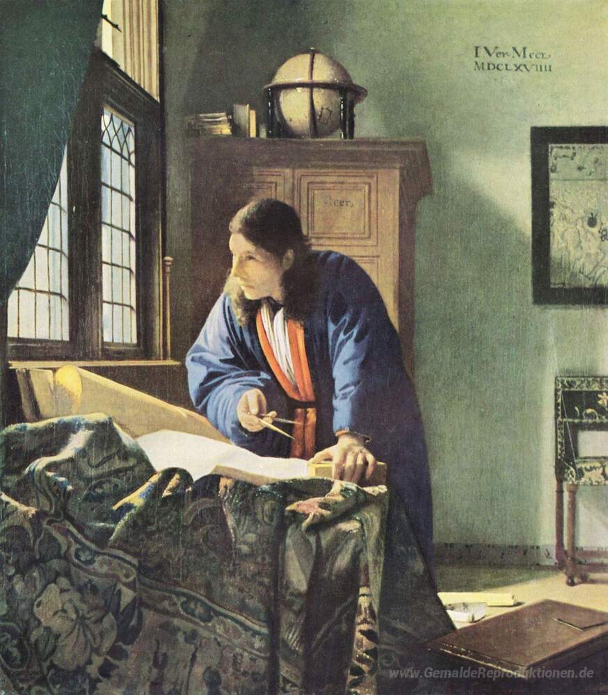 Wir bieten Ihnen eine handgefertigte Reproduktion auf Leinwand des berühmten Kunstwerks 'Der Geograph' von Johannes Vermeer, aus dem Reproduktionsmuseum.