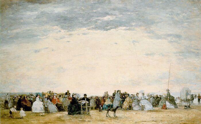 Wir bieten Ihnen eine handgefertigte Reproduktion auf Leinwand des berühmten Kunstwerks 'Der Strand von Trouville' von Eugene Boudin, aus dem Reproduktionsmuseum.