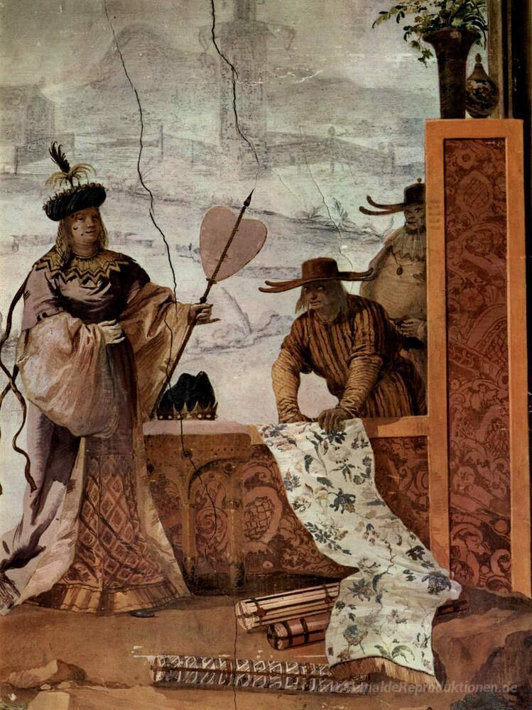 Wir bieten Ihnen eine handgefertigte Reproduktion auf Leinwand des berühmten Kunstwerks 'Der Textilkaufmann, von der chinesischen Zimmer im Foresteria' von Giovanni Domenico Tiepolo, aus dem Reproduktionsmuseum.
