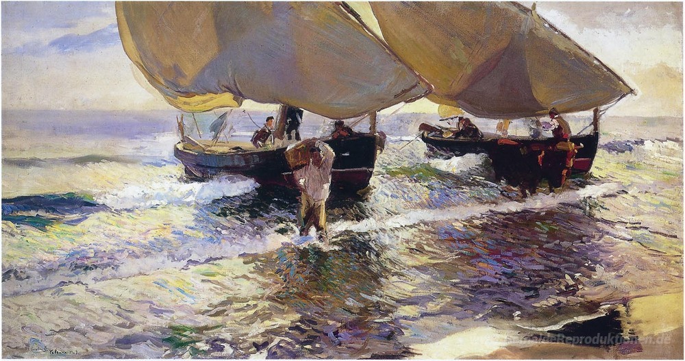 Wir bieten Ihnen eine handgefertigte Reproduktion auf Leinwand des berühmten Kunstwerks 'Die Ankunft der Boote' von Joaquín Sorolla, aus dem Reproduktionsmuseum.