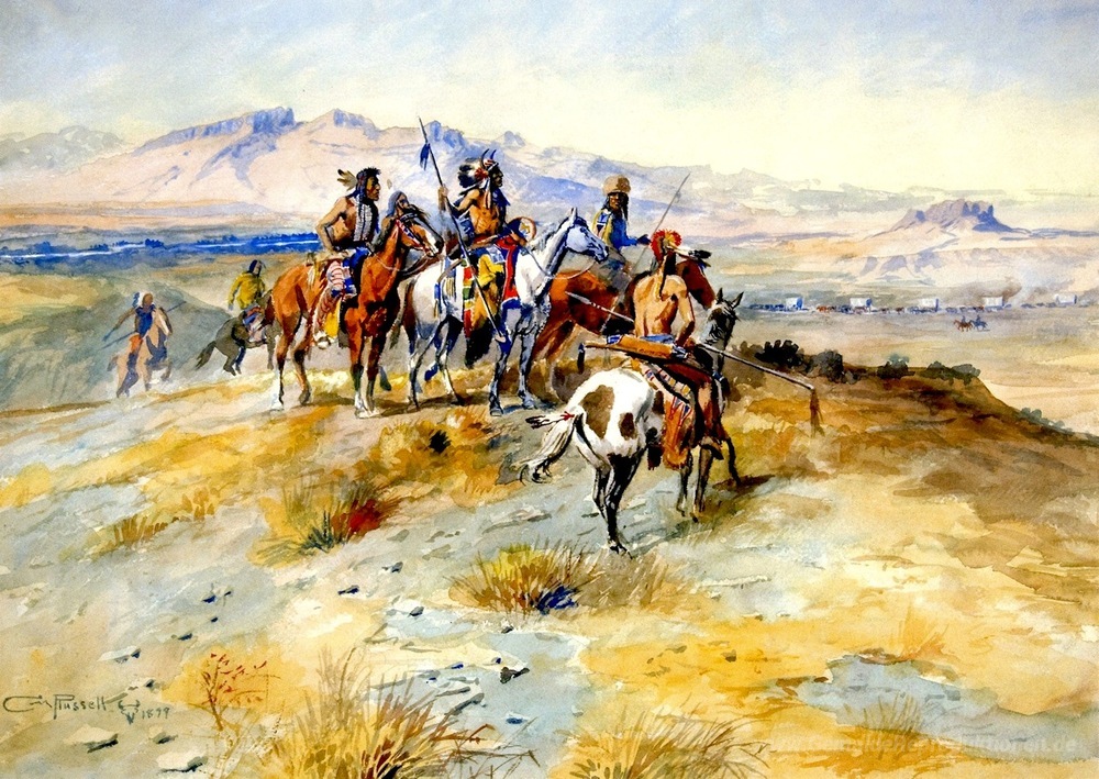 Wir bieten Ihnen eine handgefertigte Reproduktion auf Leinwand des berühmten Kunstwerks 'Die Ankunft des weißen Mannes' von Charles M. Russell, aus dem Reproduktionsmuseum.