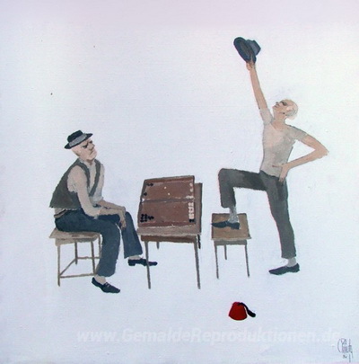 Wir bieten Ihnen eine handgefertigte Reproduktion auf Leinwand des berühmten Kunstwerks 'Die Backgammon-Spieler' von Constantin Piliuta, aus dem Reproduktionsmuseum.