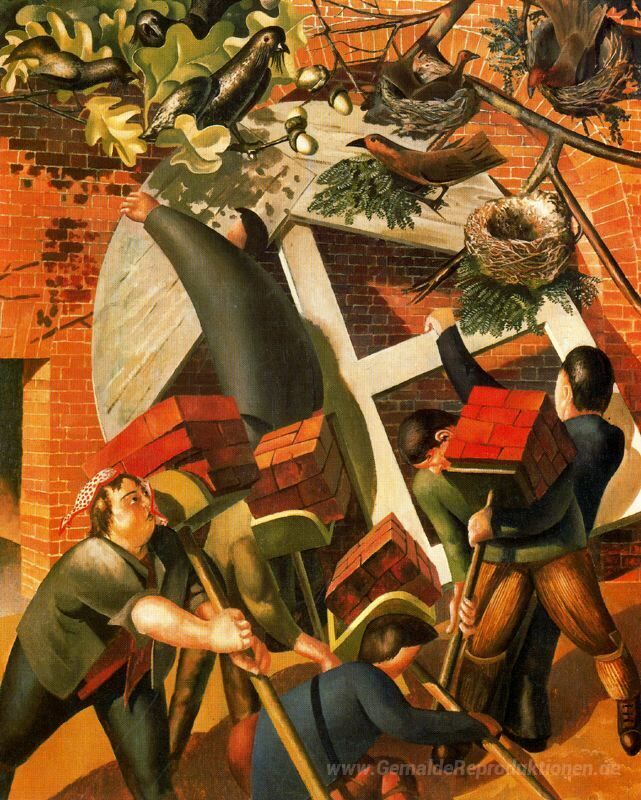 Wir bieten Ihnen eine handgefertigte Reproduktion auf Leinwand des berühmten Kunstwerks 'Die Bauherren' von Stanley Spencer, aus dem Reproduktionsmuseum.