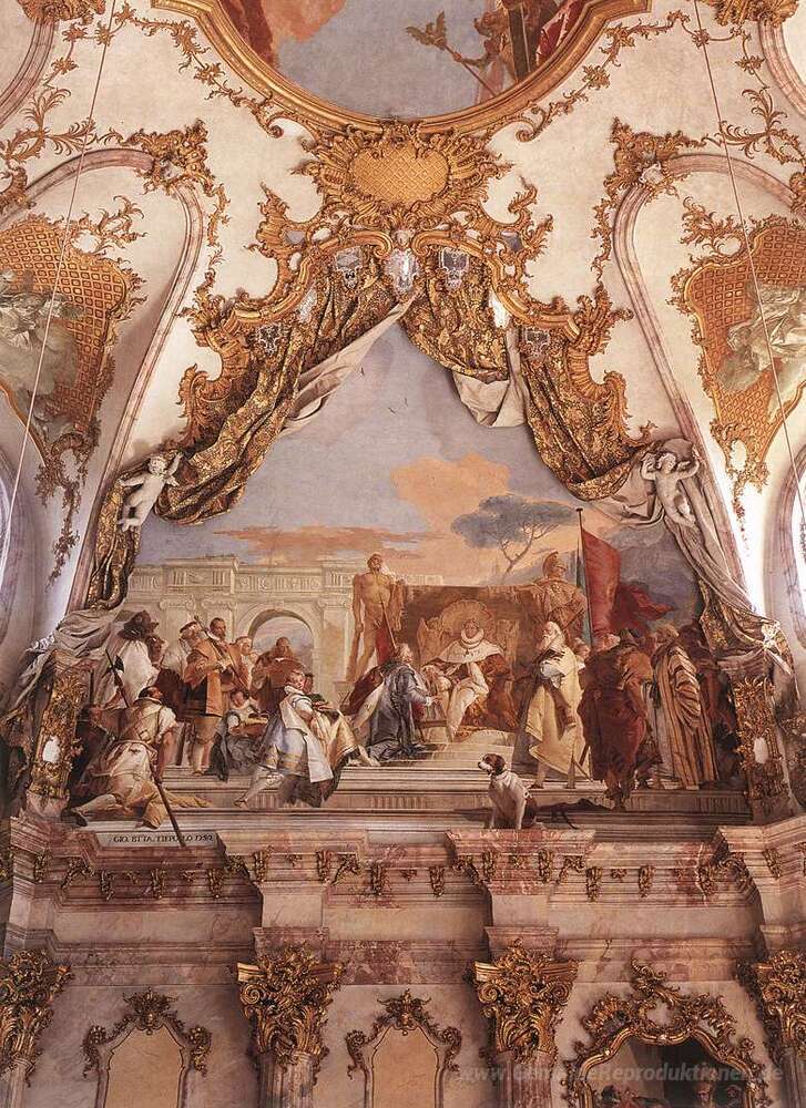 Wir bieten Ihnen eine handgefertigte Reproduktion auf Leinwand des berühmten Kunstwerks 'Die Einsetzung von Herold als Herzog von Franken' von Giovanni Battista Tiepolo, aus dem Reproduktionsmuseum.