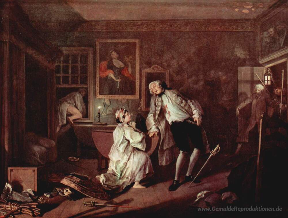 Herzlich willkommen in unserer exklusiven Sammlung von Ölgemälden, die wahre Meisterwerke der Kunstgeschichte umfassen. Eines unserer herausragenden Stücke ist Die Ermordung der Zählung, geschaffen von dem renommierten Künstler William Hogarth. Hogarth, bekannt für seine detaillierten Erzählungen und lebendigen Darstellungen, nutzt in diesem Werk seine einzigartige Fähigkeit, menschliche Emotionen und gesellschaftliche Themen zu erfassen.