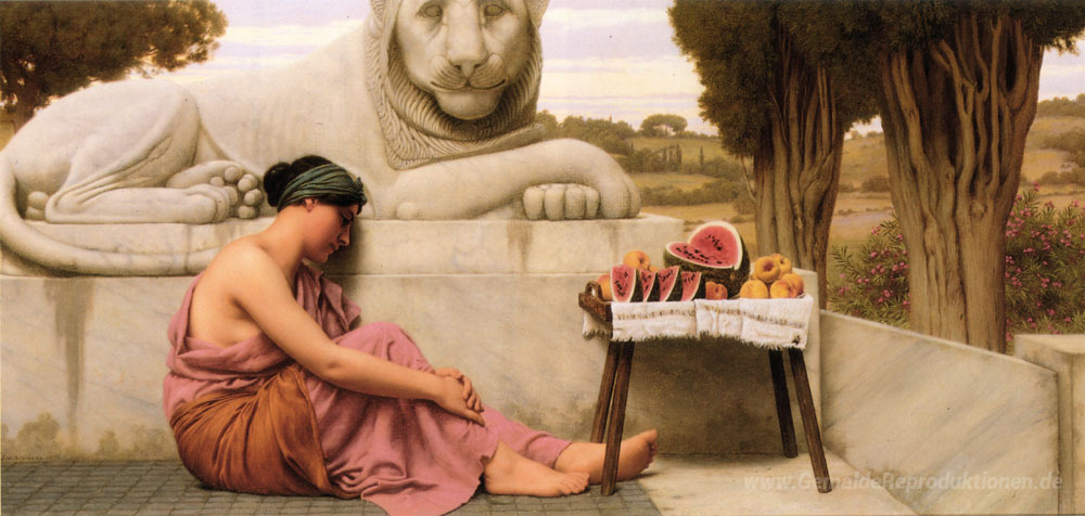 Wir bieten Ihnen eine handgefertigte Reproduktion auf Leinwand des berühmten Kunstwerks 'Die Frucht-Verkäufer' von John William Godward, aus dem Reproduktionsmuseum.