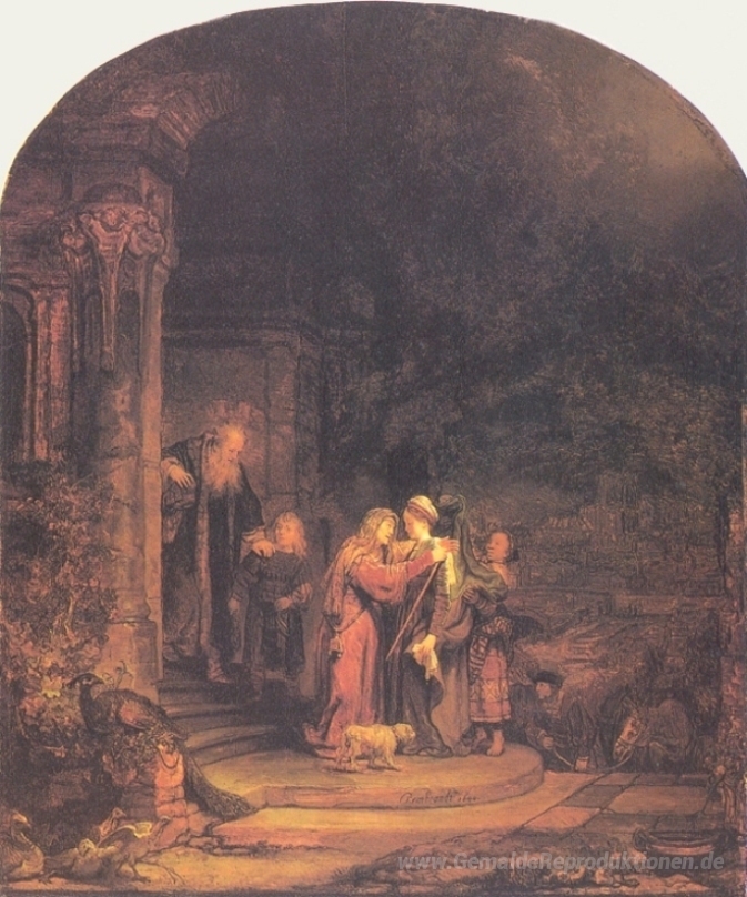 Wir bieten Ihnen eine handgefertigte Reproduktion auf Leinwand des berühmten Kunstwerks 'Die Heimsuchung' von Rembrandt, aus dem Reproduktionsmuseum.
