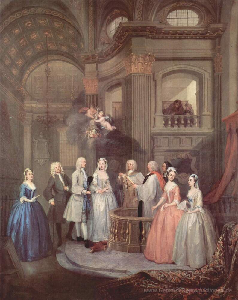 Wir bieten Ihnen eine handgefertigte Reproduktion auf Leinwand des berühmten Kunstwerks 'Die Hochzeit von Stephen Beckingham und von Mary' von William Hogarth, aus dem Reproduktionsmuseum.