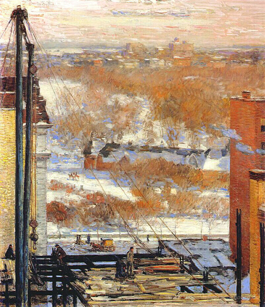 Wir bieten Ihnen eine handgefertigte Reproduktion auf Leinwand des berühmten Kunstwerks 'Die Hovel und die Wolkenkratzer' von Childe Hassam, aus dem Reproduktionsmuseum.