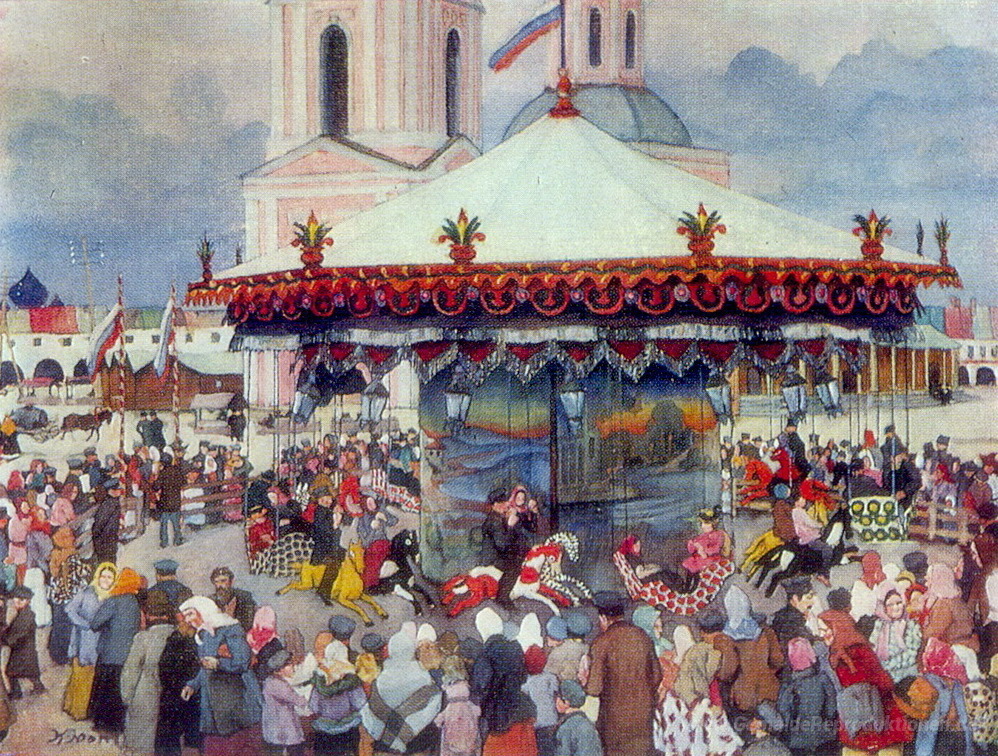 Wir bieten Ihnen eine handgefertigte Reproduktion auf Leinwand des berühmten Kunstwerks 'Die Karussell-' von Konstantin Yuon, aus dem Reproduktionsmuseum.