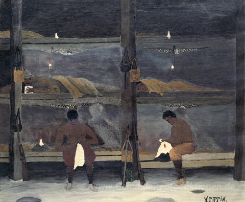 Willkommen in unserer exquisiten Sammlung von Ölgemälden, in der jedes Werk eine Geschichte erzählt und den Raum, den es ziert, in ein Kunstwerk verwandelt. Eines unserer herausragenden Stücke ist Die Kaserne, geschaffen von dem talentierten Künstler Horace Pippin. Pippin, ein führender Vertreter der amerikanischen Folk-Art, fängt in seinen Arbeiten die Essenz des Lebens und die Emotionen seiner Zeit ein.