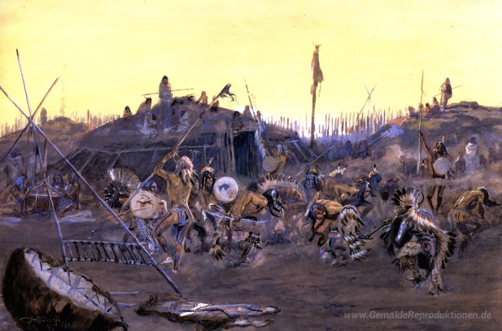 Wir bieten Ihnen eine handgefertigte Reproduktion auf Leinwand des berühmten Kunstwerks 'Die Mandan Tanz' von Charles M. Russell, aus dem Reproduktionsmuseum.