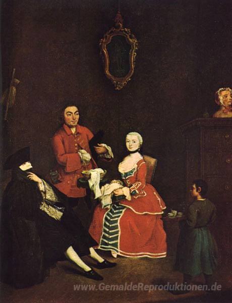 Wir bieten Ihnen eine handgefertigte Reproduktion auf Leinwand des berühmten Kunstwerks 'Die maskierte Besucher' von Pietro Longhi, aus dem Reproduktionsmuseum.