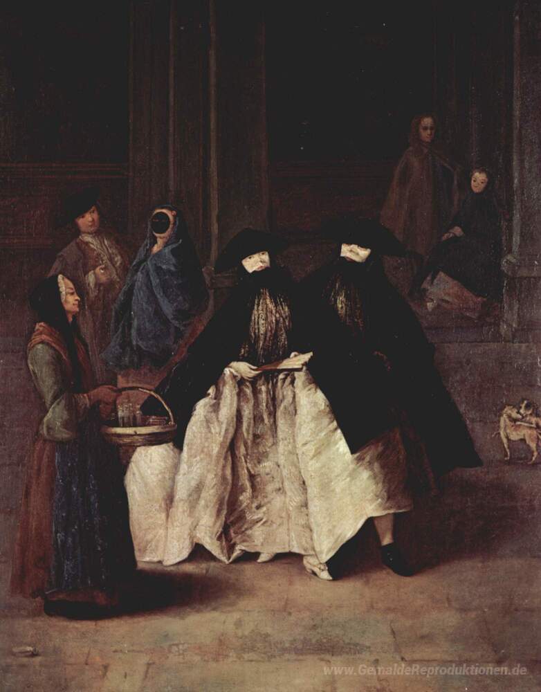 Wir bieten Ihnen eine handgefertigte Reproduktion auf Leinwand des berühmten Kunstwerks 'Die Perfume Verkäufer' von Pietro Longhi, aus dem Reproduktionsmuseum.