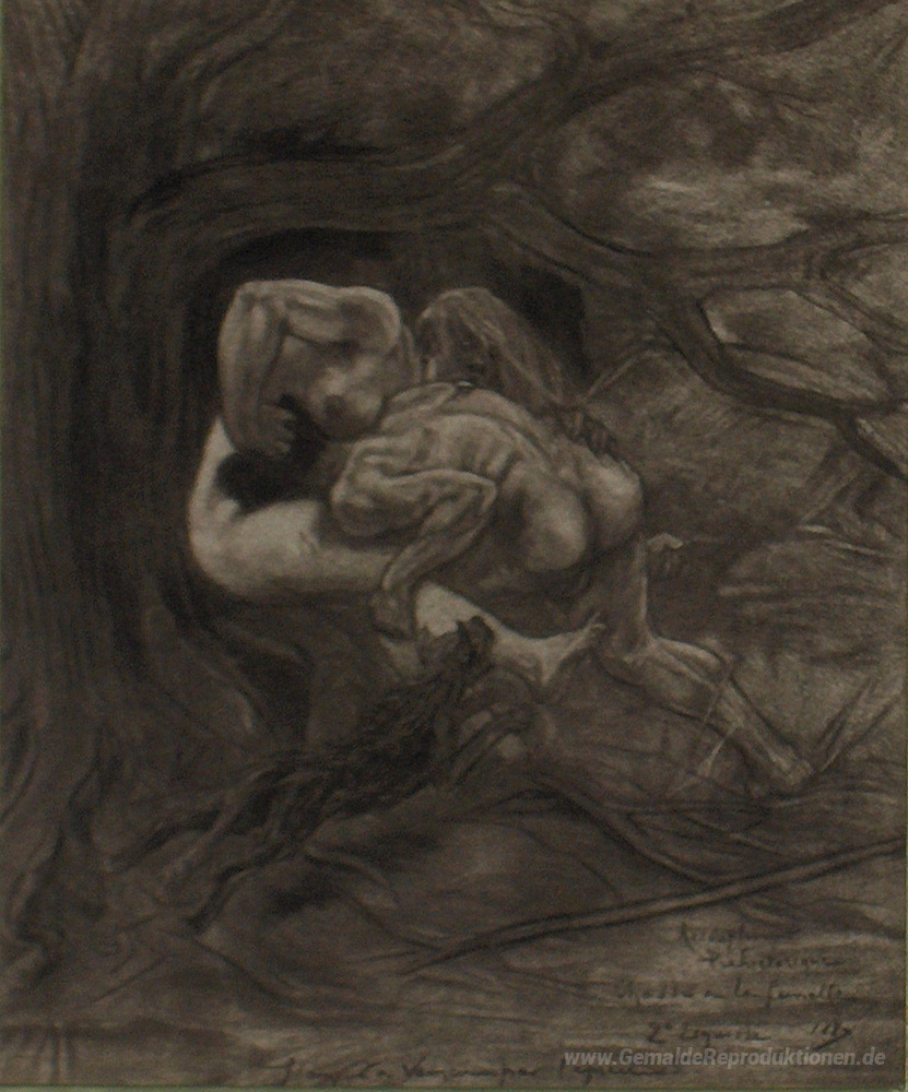 Wir bieten Ihnen eine handgefertigte Reproduktion auf Leinwand des berühmten Kunstwerks 'Die Prähistorische Paarung oder der Jagd nach dem Femal' von Felicien Rops, aus dem Reproduktionsmuseum.