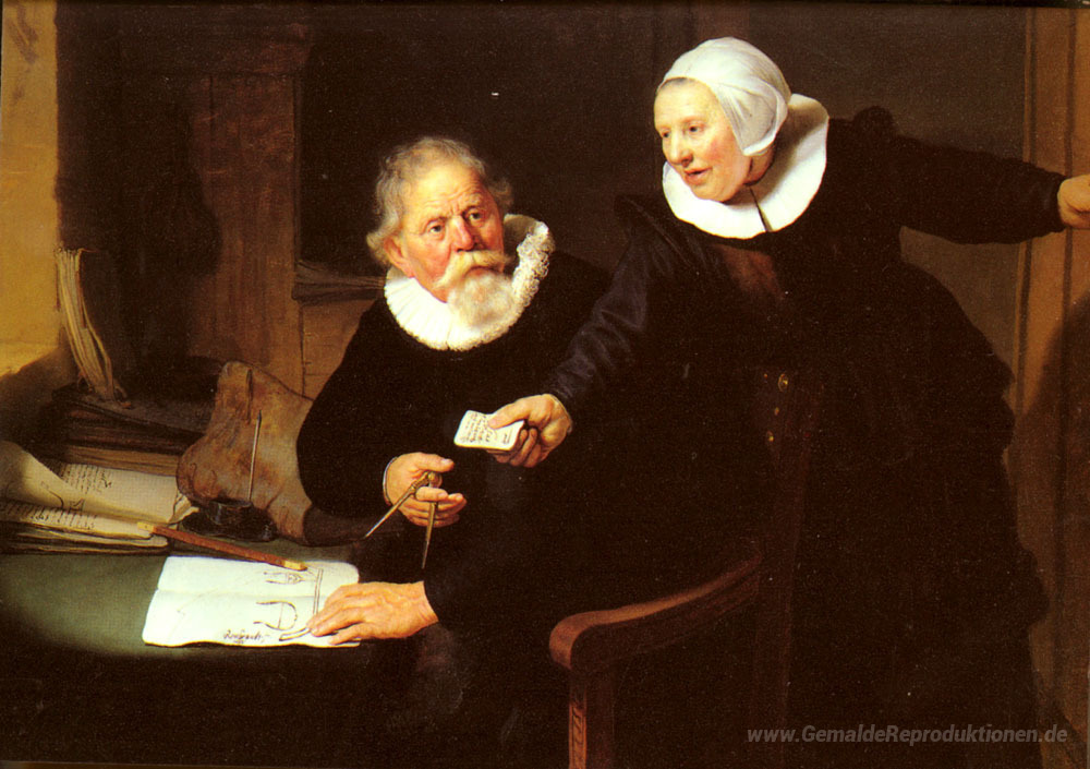 Wir bieten Ihnen eine handgefertigte Reproduktion auf Leinwand des berühmten Kunstwerks 'Die Schiffbauer und seine Frau' von Rembrandt, aus dem Reproduktionsmuseum.
