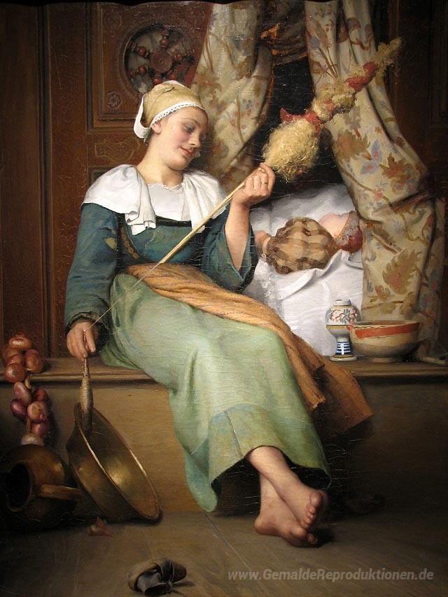 Wir bieten Ihnen eine handgefertigte Reproduktion auf Leinwand des berühmten Kunstwerks 'Die Spinner' von Paul Peel, aus dem Reproduktionsmuseum.