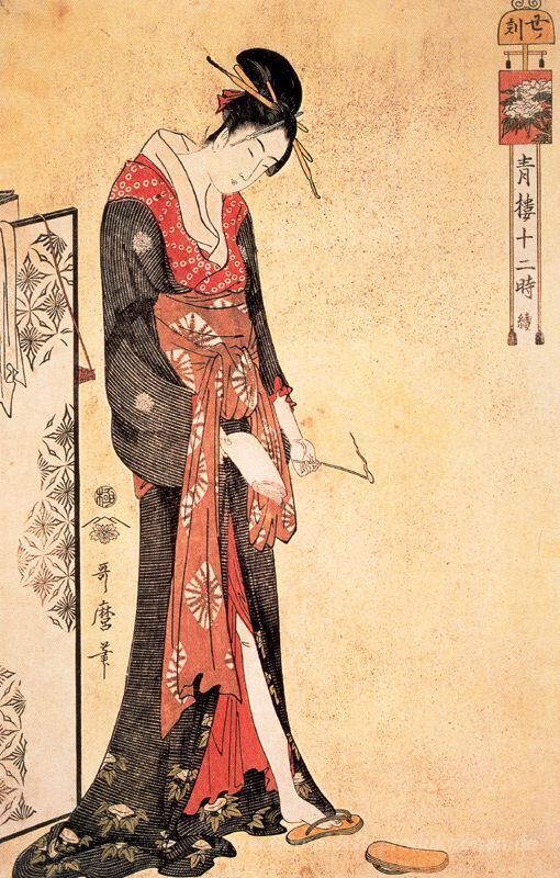 Wir bieten Ihnen eine handgefertigte Reproduktion auf Leinwand des berühmten Kunstwerks 'Die Stunde der Schlange' von Kitagawa Utamaro, aus dem Reproduktionsmuseum.