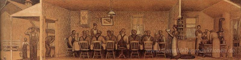 Wir bieten Ihnen eine handgefertigte Reproduktion auf Leinwand des berühmten Kunstwerks 'Die Thresher Abendmahl' von Grant Wood, aus dem Reproduktionsmuseum.