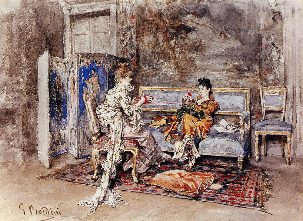 Wir bieten Ihnen eine handgefertigte Reproduktion auf Leinwand des berühmten Kunstwerks 'Die Unterhaltung' von Giovanni Boldini, aus dem Reproduktionsmuseum.