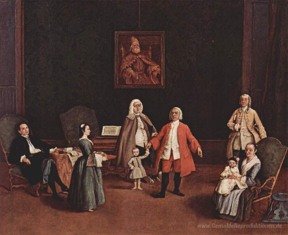 Wir bieten Ihnen eine handgefertigte Reproduktion auf Leinwand des berühmten Kunstwerks 'Die venezianische Familie' von Pietro Longhi, aus dem Reproduktionsmuseum.