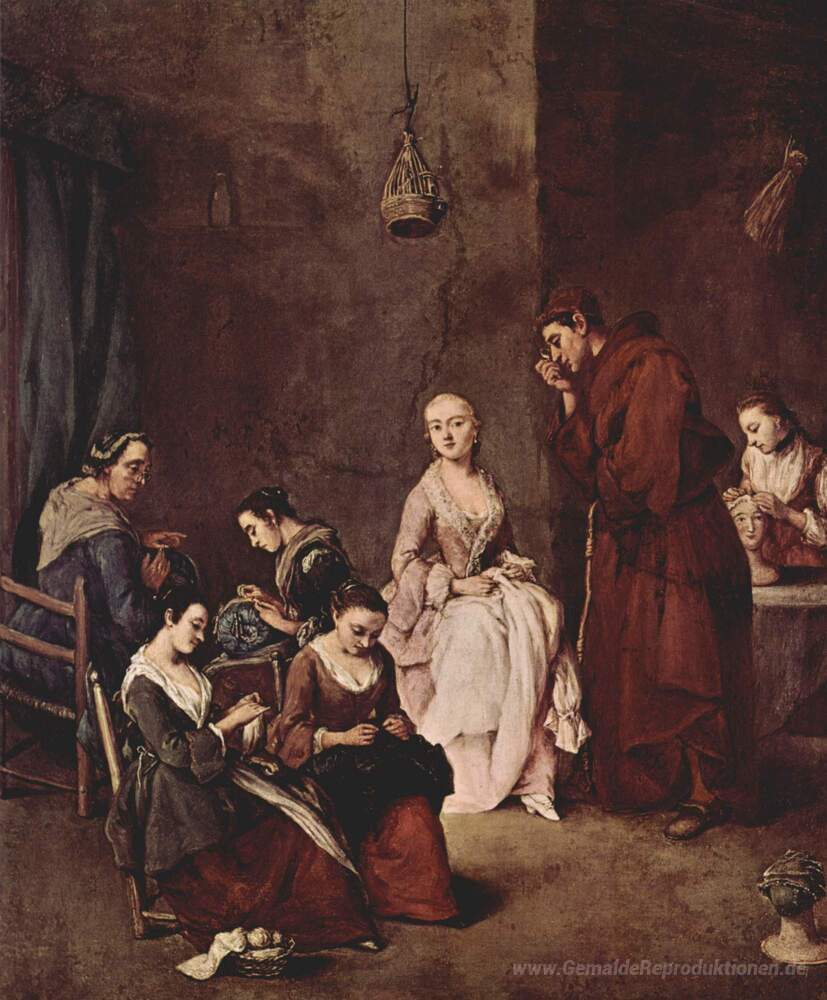 Wir bieten Ihnen eine handgefertigte Reproduktion auf Leinwand des berühmten Kunstwerks 'Die Versuchung' von Pietro Longhi, aus dem Reproduktionsmuseum.