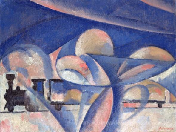 Wir bieten Ihnen eine handgefertigte Reproduktion auf Leinwand des berühmten Kunstwerks 'Die Zusammensetzung mit dem Zug' von Olga Rozanova, aus dem Reproduktionsmuseum.