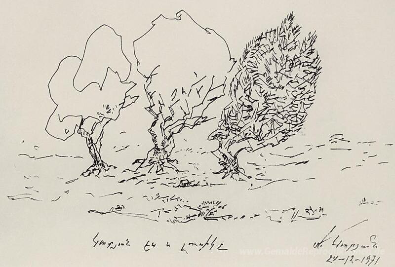 Wir bieten Ihnen eine handgefertigte Reproduktion auf Leinwand des berühmten Kunstwerks 'Drei Bäume (Kate, Lusik und ich)' von Martiros Saryan, aus dem Reproduktionsmuseum.