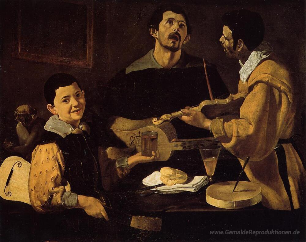 Wir bieten Ihnen eine handgefertigte Reproduktion auf Leinwand des berühmten Kunstwerks 'Drei Musiker' von Diego Velazquez, aus dem Reproduktionsmuseum.