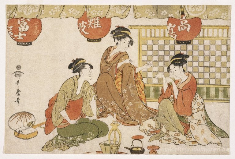 Wir bieten Ihnen eine handgefertigte Reproduktion auf Leinwand des berühmten Kunstwerks 'Drei Sitzende Damen mit Laternen' von Kitagawa Utamaro, aus dem Reproduktionsmuseum.