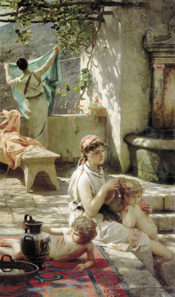 Die kunstvollen Techniken von Siemiradzki verleihen jedem Stück eine unverwechselbare Tiefe und Dimension. „Durch einen Pool“ entfaltet eine entspannende Atmosphäre und bringt Eleganz in jeden Raum. Wenn Sie dieses beeindruckende Gemälde in Ihrem Zuhause präsentieren, verwandelt es Ihre Umgebung und schafft eine harmonische Verbindung zwischen Kunst und Lebensstil. Lassen Sie sich von der Kraft der Malerei inspirieren und bereichern Sie Ihr Zuhause mit einem zeitlosen Kunstwerk.