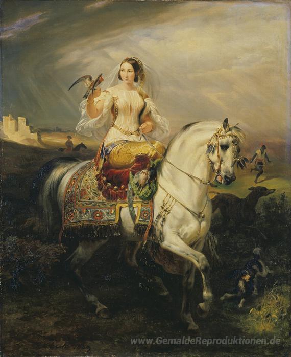 Wir bieten Ihnen eine handgefertigte Reproduktion auf Leinwand des berühmten Kunstwerks 'Ein algerischer Lady Hawking' von Horace Vernet, aus dem Reproduktionsmuseum.