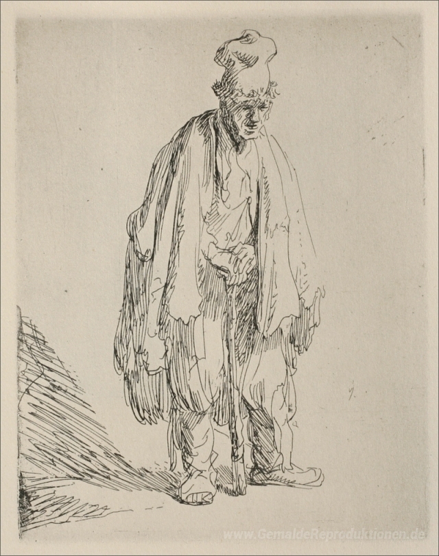 Wir bieten Ihnen eine handgefertigte Reproduktion auf Leinwand des berühmten Kunstwerks 'Ein Bettler Standing und auf einen Stock gestützt' von Rembrandt, aus dem Reproduktionsmuseum.