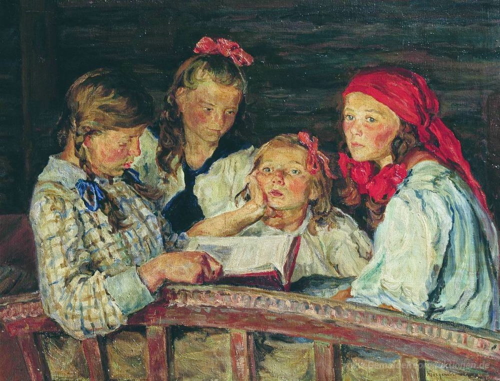 Wir bieten Ihnen eine handgefertigte Reproduktion auf Leinwand des berühmten Kunstwerks 'Ein Buch lesen' von Nikolay Bogdanov-Belsky, aus dem Reproduktionsmuseum.