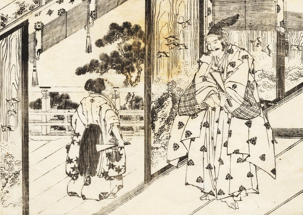 Wir bieten Ihnen eine handgefertigte Reproduktion auf Leinwand des berühmten Kunstwerks 'Ein gut erzogener Junge zahlt Bezug auf einen älteren Mann' von Katsushika Hokusai, aus dem Reproduktionsmuseum.