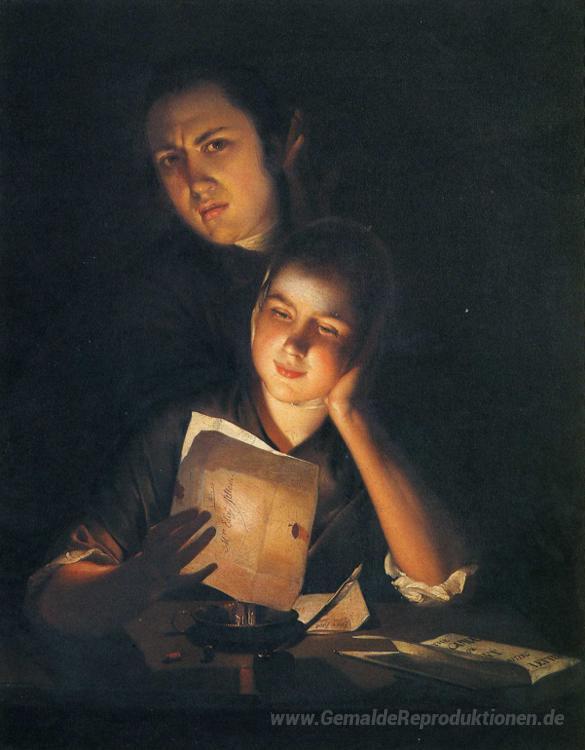 Wir bieten Ihnen eine handgefertigte Reproduktion auf Leinwand des berühmten Kunstwerks 'Ein Mädchen, die einen Brief durch Kerzenlicht, mit einem jungen' von Joseph Wright, aus dem Reproduktionsmuseum.