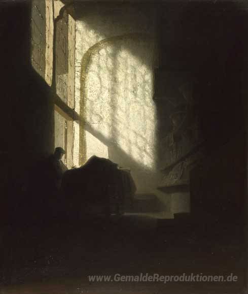 Wir bieten Ihnen eine handgefertigte Reproduktion auf Leinwand des berühmten Kunstwerks 'Ein Mann in einem Zimmer' von Rembrandt, aus dem Reproduktionsmuseum.