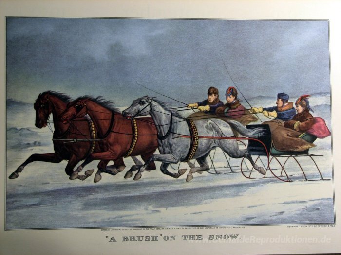 Wir bieten Ihnen eine handgefertigte Reproduktion auf Leinwand des berühmten Kunstwerks 'Ein Pinsel auf dem Schnee' von Currier and Ives, aus dem Reproduktionsmuseum.