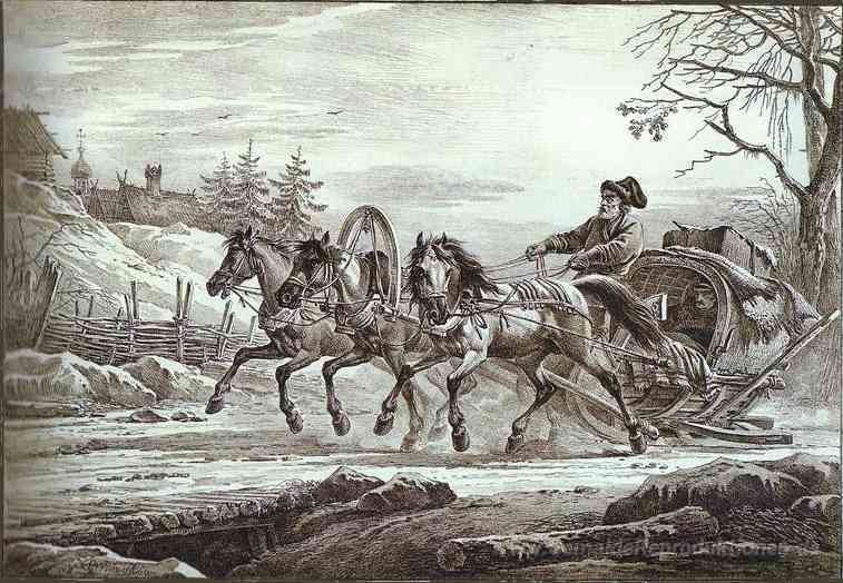 Wir bieten Ihnen eine handgefertigte Reproduktion auf Leinwand des berühmten Kunstwerks 'Ein Reisender in einer kibitka (Kapuzenwagen oder Schlitten)' von Alexander Orlowski, aus dem Reproduktionsmuseum.