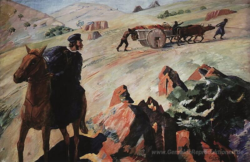 Wir bieten Ihnen eine handgefertigte Reproduktion auf Leinwand des berühmten Kunstwerks 'Ein Treffen Puschkin mit der Beförderung, mit dem Leichnam des G' von Martiros Saryan, aus dem Reproduktionsmuseum.