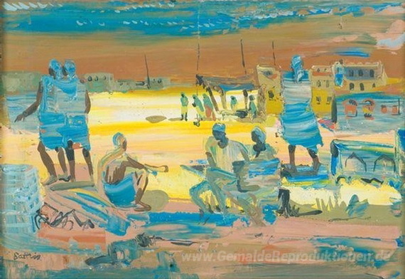 Wir bieten Ihnen eine handgefertigte Reproduktion auf Leinwand des berühmten Kunstwerks 'Eine Versammlung' von Walter Battiss, aus dem Reproduktionsmuseum.